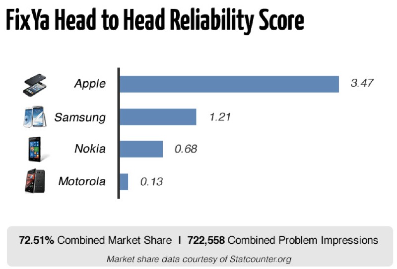 FixYa has recently compiled information from over 7,20,000 cell phones problems. The compilation consisted of issues that the users face with their phone, precisely with the phone’s hardware. They compiled this information for only 4 manufacturers; Apple, Samsung, Nokia and Motorola. And the result showed us the most and the least reliable phone manufacturer. No prize for guessing that Apple iPhone was the winner in the results. It was found to be way more reliable than Samsung. Read on to find out.