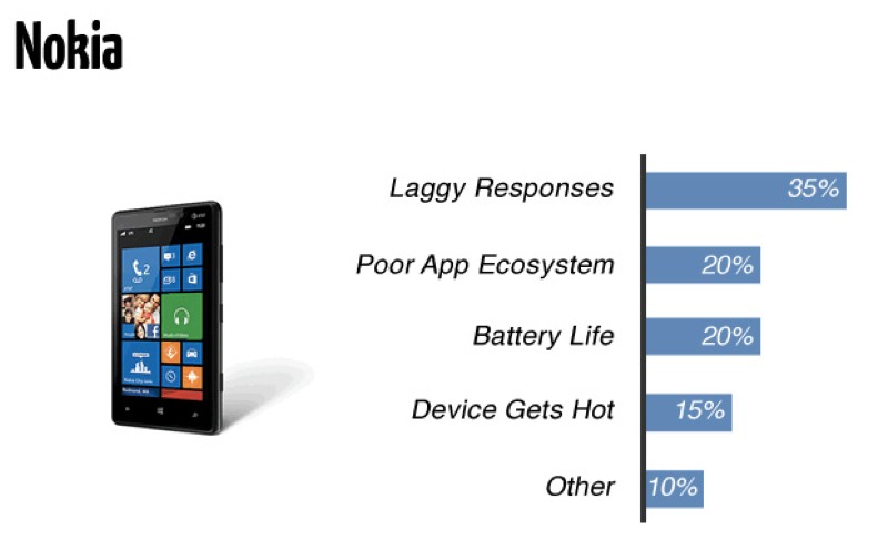 And finally, we come to Nokia. Nokia may never touch that peak that it once comfortably stayed in for a long time. A lot of uses had a lot of complaints with Nokia. Starting with the Laggy responses from the applications, in other words, it takes a long time to load. The App ecosystem was second most complained about. It is understandable, as Windows is still in a very nascent stage when it comes to apps. Battery life was another major complain and so was Device getting hot. Once again, apart from battery life and device getting hot, there was not major hardware related issue reported.